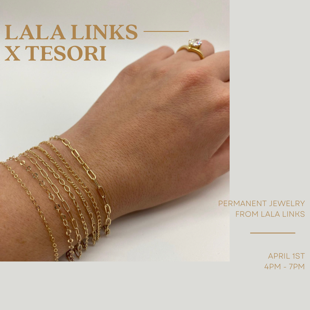 Join us for our Lala Links Pop Up shop at Tesori. Lala Links creates beautiful jewelry that is fit custom to your wrist and does not have a clasp. This event is open to the public and not just for brides so grab your best friend and create a stack with Lala Links while enjoying bubbles + treats.